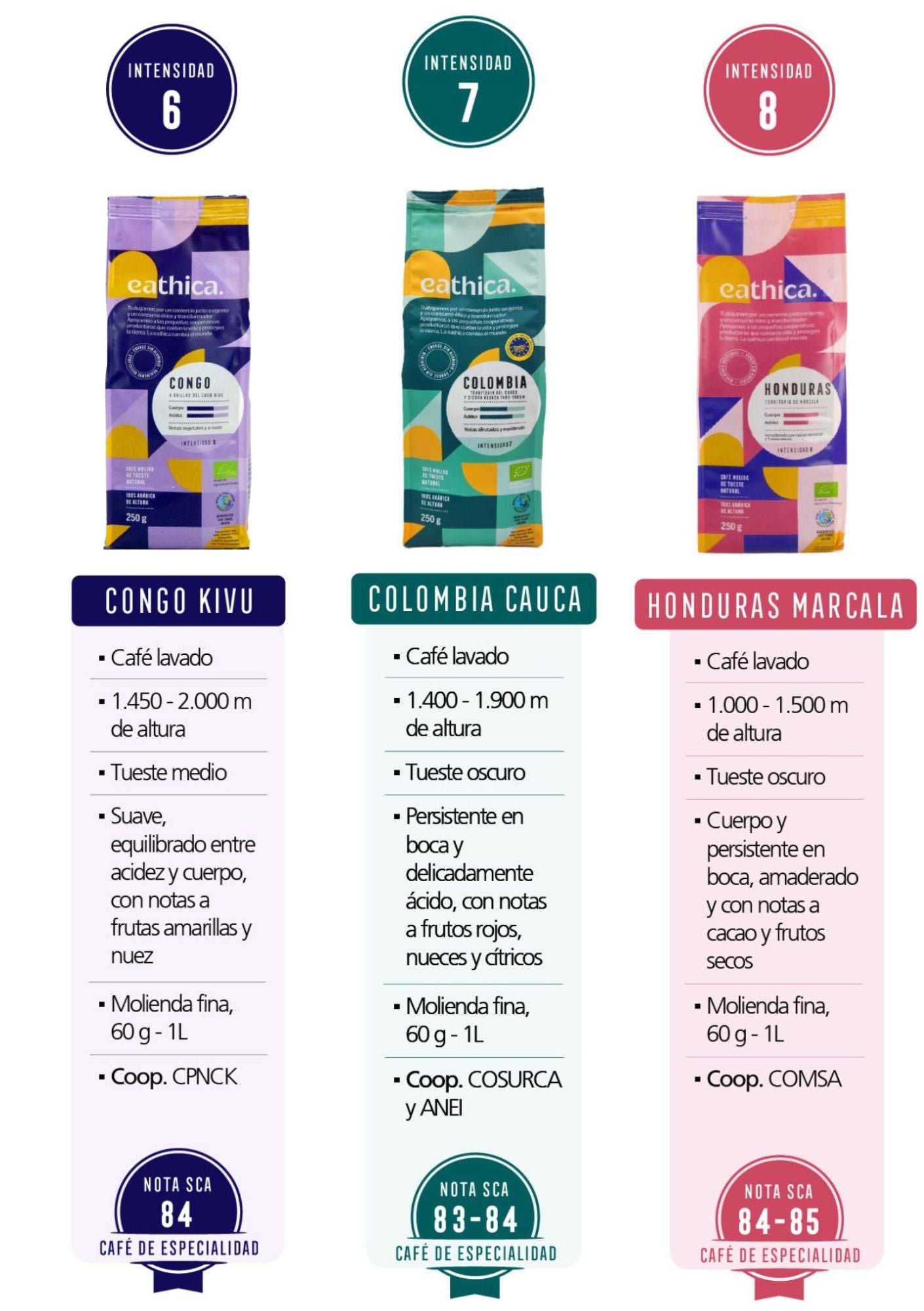 Café de especialidad (nota SCA 84), ecológico 100% arábica, cultivado entre los 1450 y 2000 m de altura, en los altiplanos congoleses, de tueste natural, de intensidad 3, muy aromático.