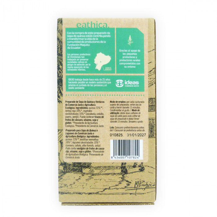 La quinoa presente en esta sopa la cultivan productoras de la organización MCCH (Maquita) en la región del Chimborazo (Ecuador), donde trabajan para preservar variedades nativas en peligro de extinción por la rápida extensión de otras variedades comerciales híbridas.