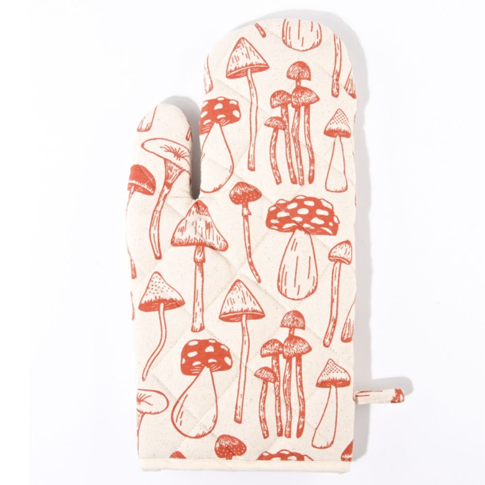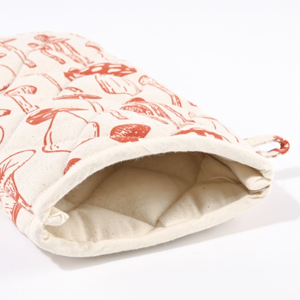 Manopla de cocina acolchada de algodón ecológico, de color crudo con diseño de setas en color teja. El regalo perfecto para "cocinillas", y un complemento útil para cualquier cocina que se precie.