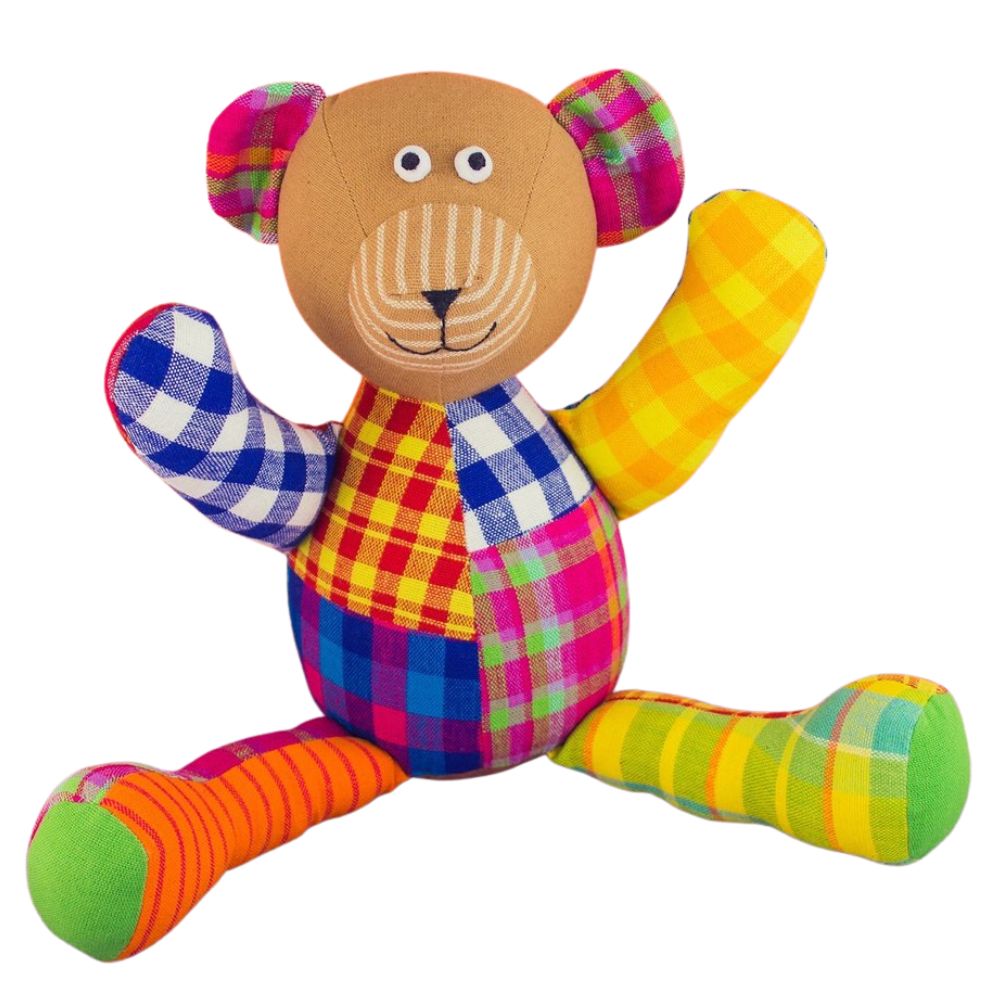 Oso de algodón elaborado artesanalmente con telas multicolor en la organización de Comercio Justo Selyn (Sri Lanka).