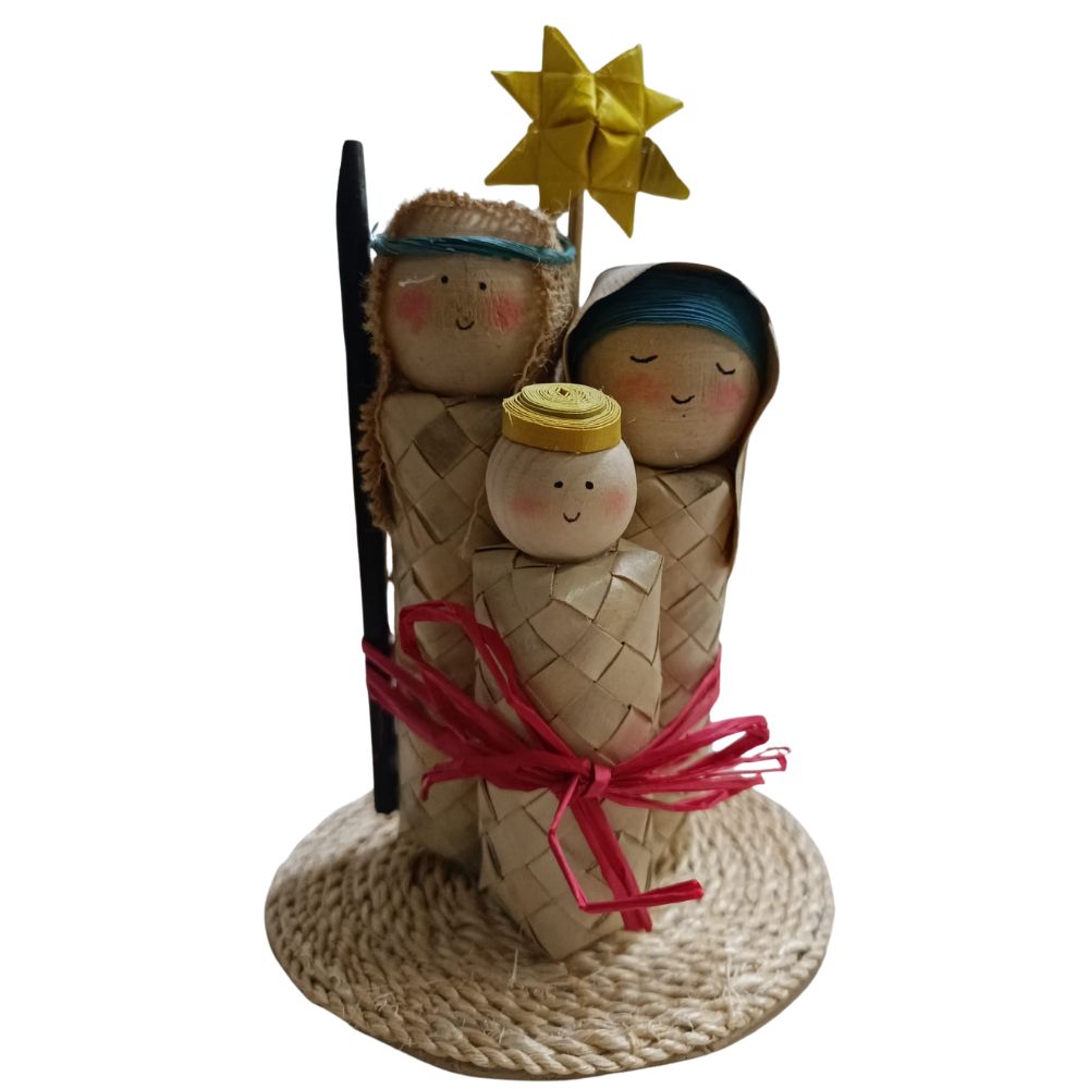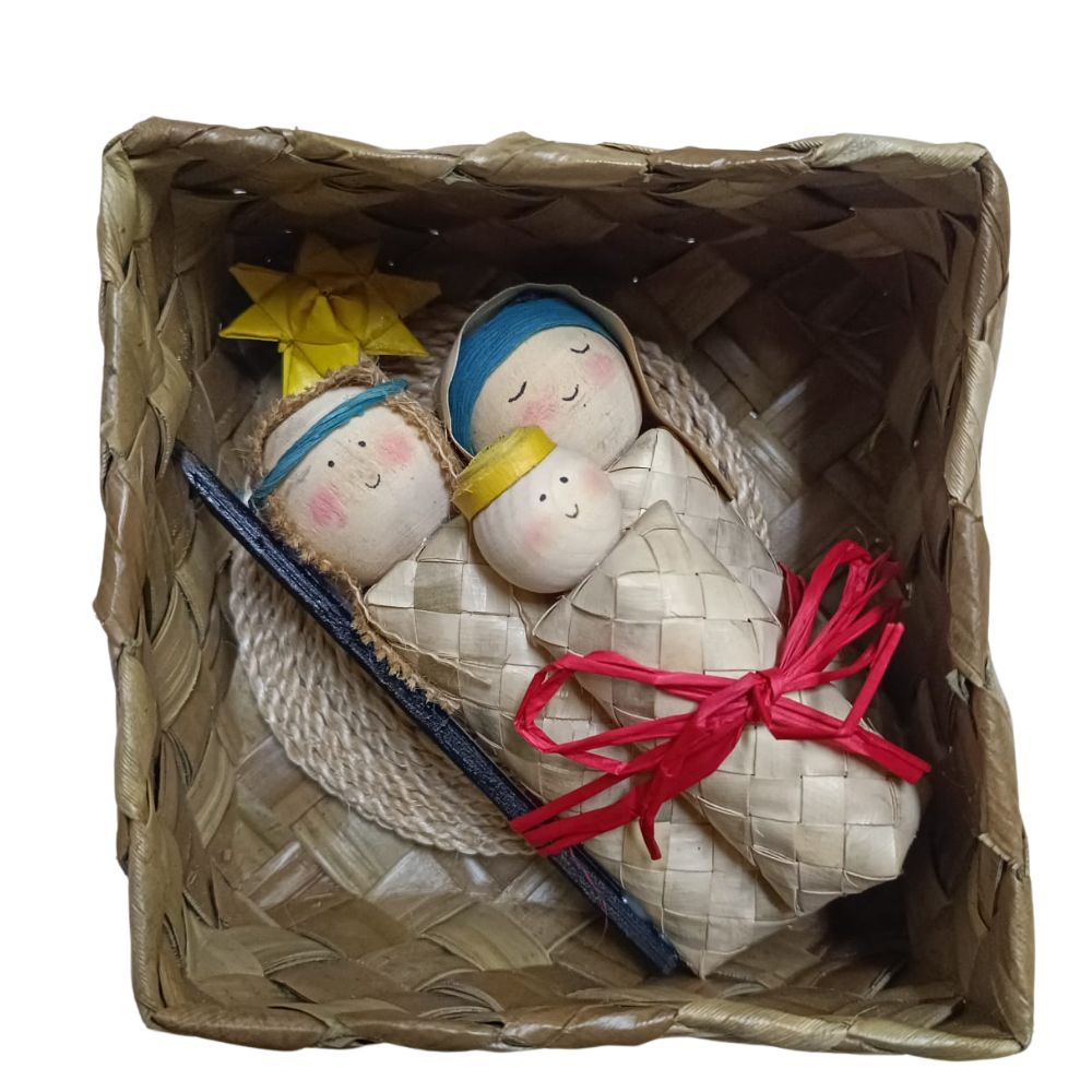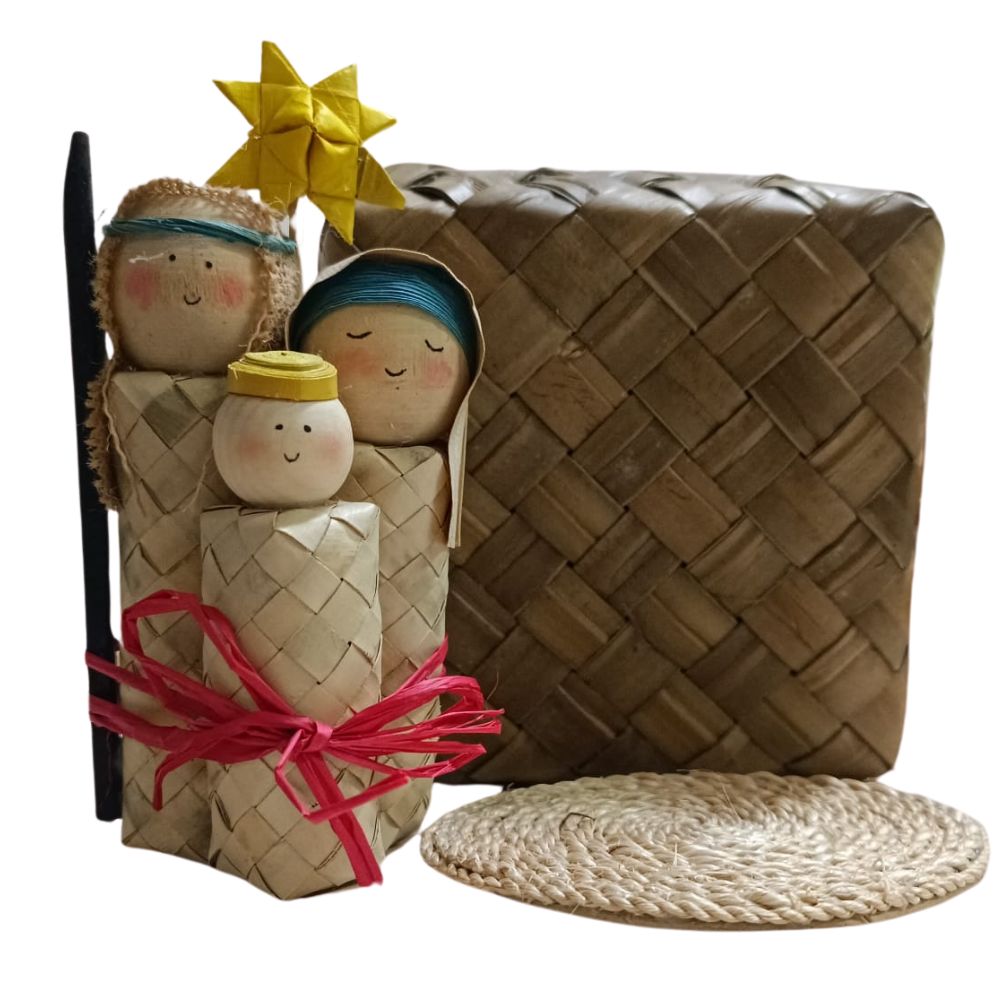 Belén artesano de Comercio Justo, procedente de Filipinas. Las figuritas del misterio, hechas en madera y fibras naturales, se guardan en cajta trenzada con hojas de palma. La caja también contiene una base redonda de fibra natural para disponer figuras.