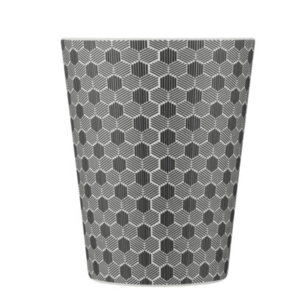 Vaso reutilizable, con diseño geométrico (dibujo de exágonos en negro y grises), creado con materiales 100% vegetales como el azúcar de remolacha y el almidón de patata.